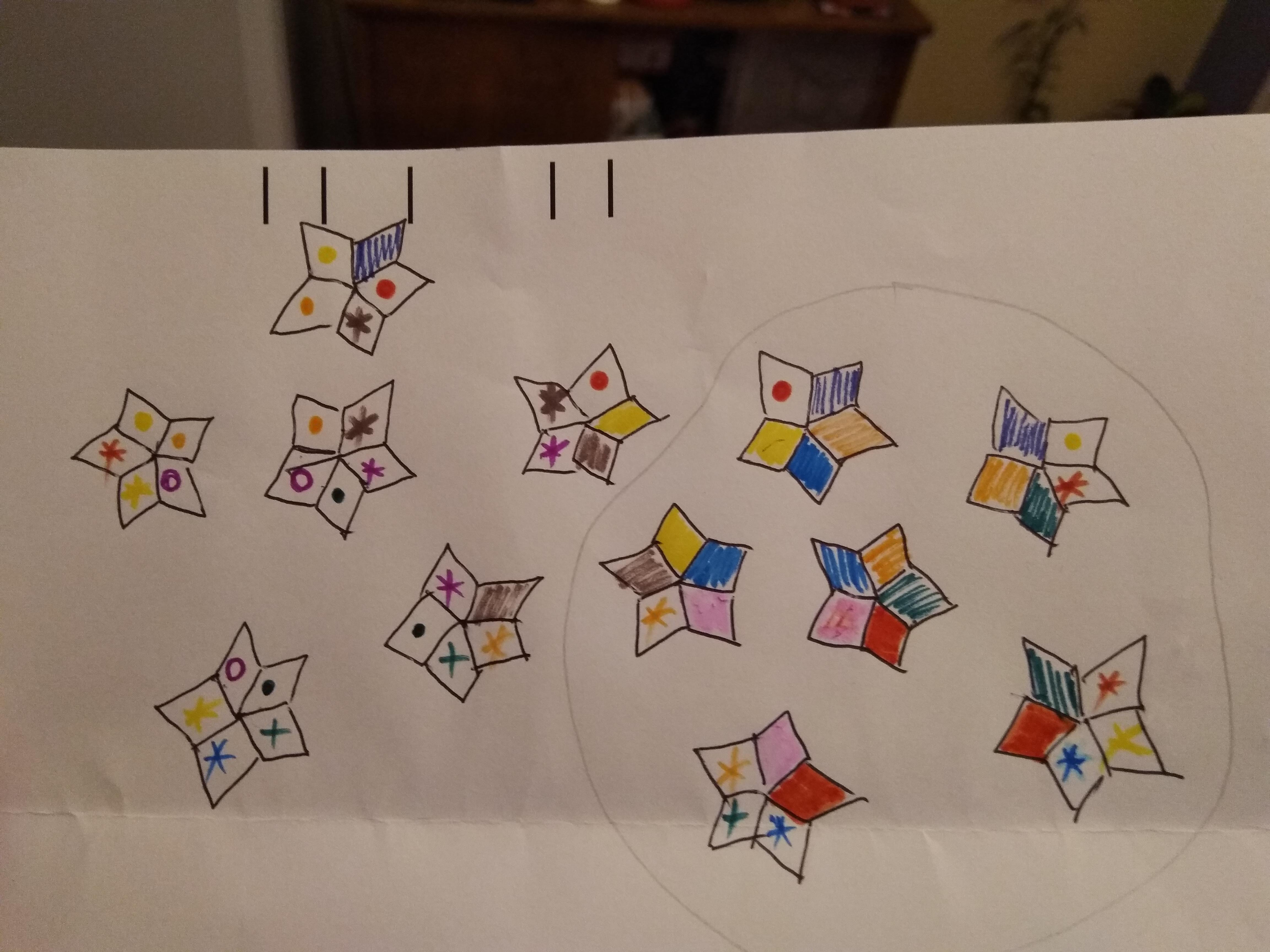I have selected 20 Christmas fabrics, cut 60 cardboard templates and prepared the diamonds with glue- 3 of each fabric print. On the back side ( on the cardboard) I have placed a color sign that reminds me of the position in the star.